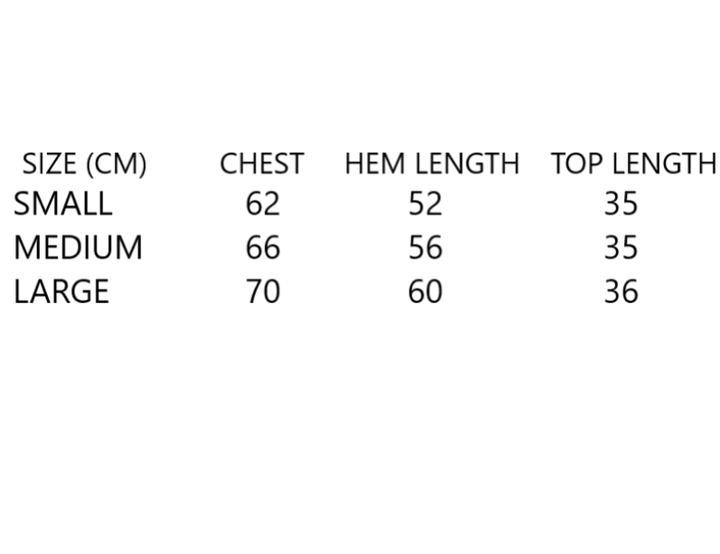 | SIZE (CM) | CHEST | HEM LENGTH | TOP LENGTH |