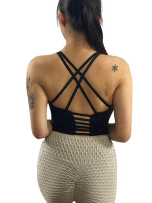 Our P.O.S.E Energise Crop Top features a round scooped neckline, cropped length, finished with double Criss Cross strapping and detailing.