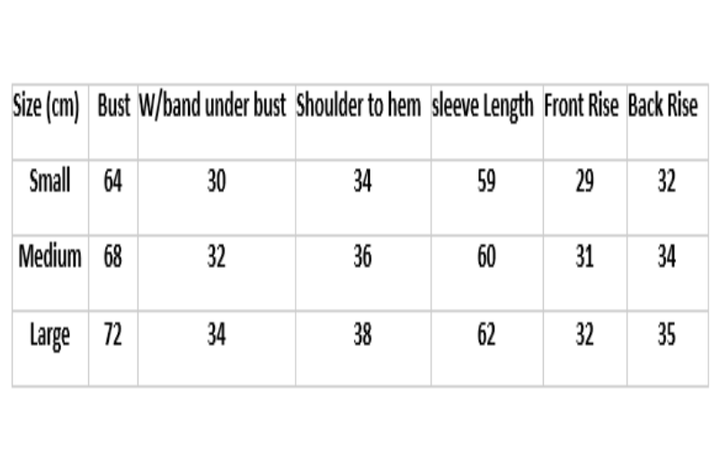 | Size (cm) | Bust | Waistband under bust | Shoulder to hem | sleeve Length | Front Rise | Back Rise |