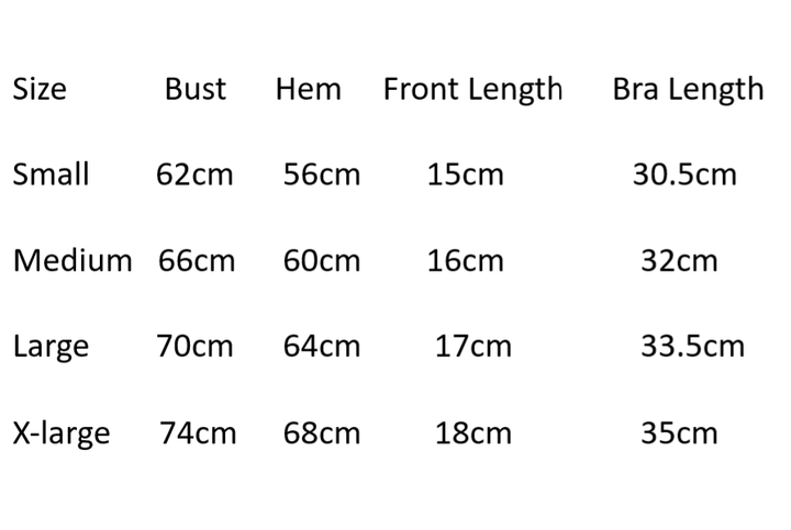 | Size | Bust | Hem | Front Length | Bra Length |