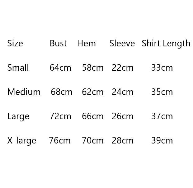 | Size | Bust | Hem | Sleeve Length | Shirts Length |
