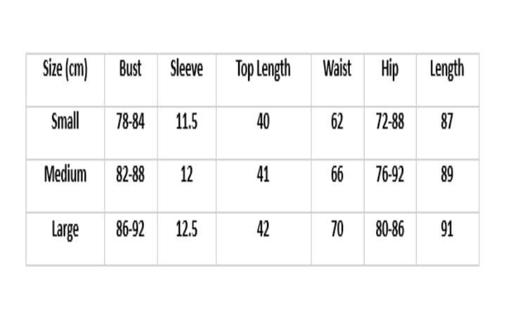 | Size (cm) | Bust | Sleeve | Top Length | Waist | Hip | Length |