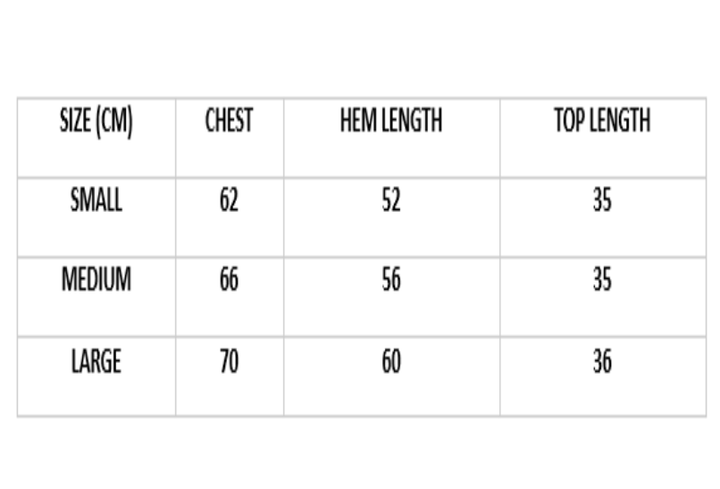 | SIZE (CM) | CHEST | HEM LENGTH | TOP LENGTH |